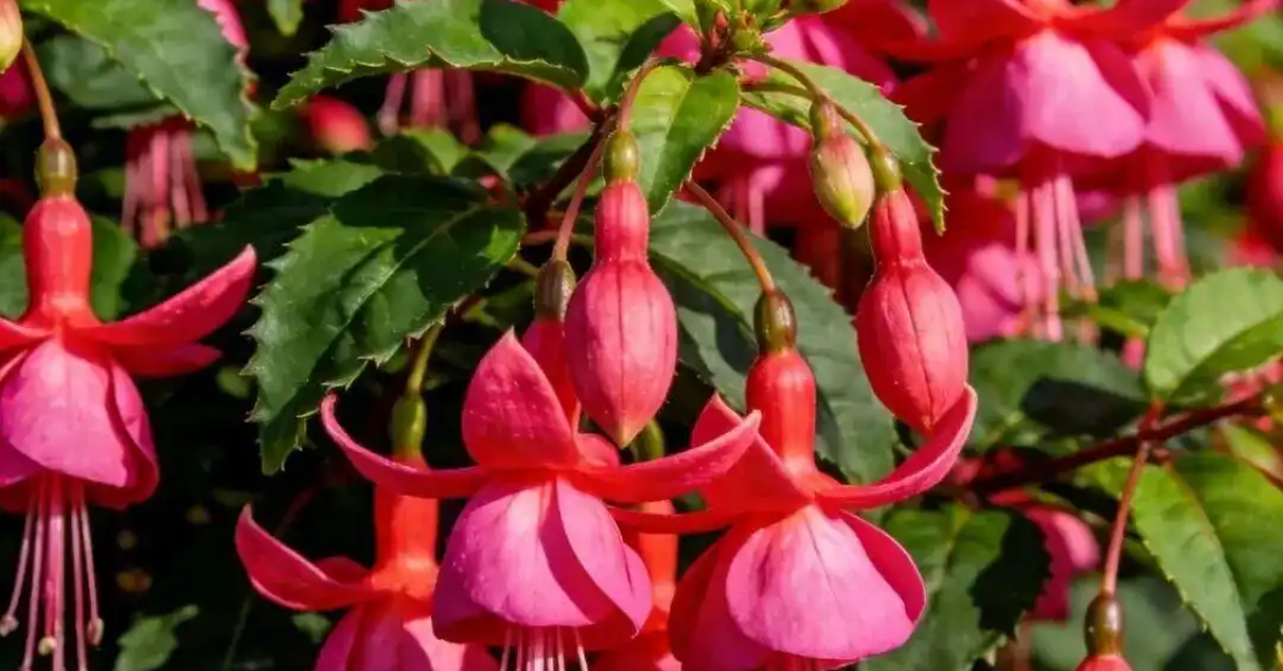 Những bông hoa rủ xuống giống chiếc đèn lồng mini, màu đỏ, hồng hoặc tím, tạo cảm giác như cả góc phòng đang bừng sáng với ánh đèn ấm áp.