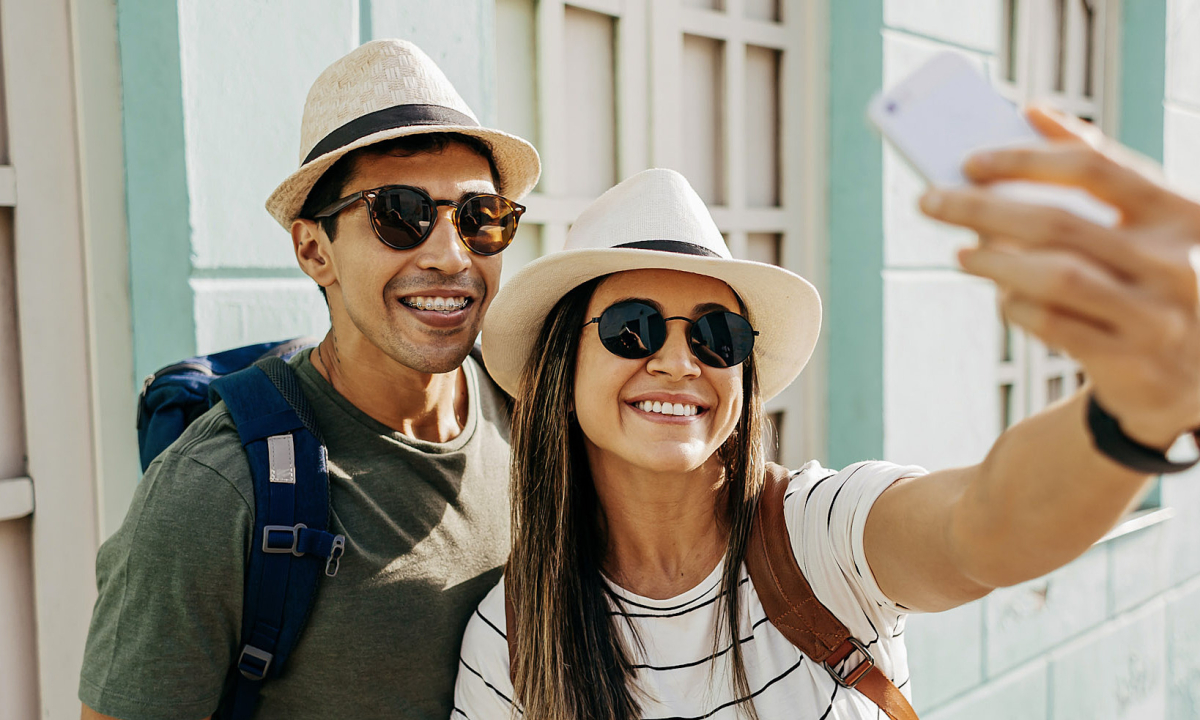 Hai du khách chụp ảnh “tự sướng” khi đi du lịch. Ảnh: Vodafone