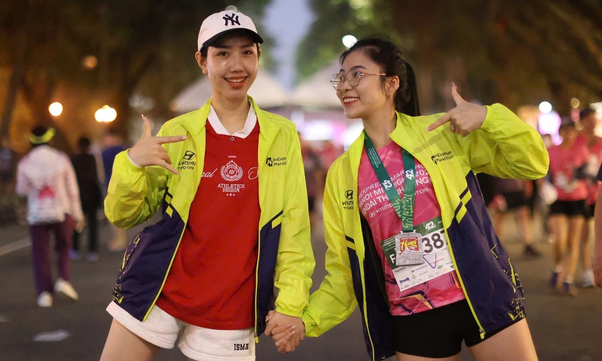 Hai runner mặc áo khoác finisher sau khi hoàn thành giải chạy đêm VnExpress Marathon Hanoi Midnight 2024. Ảnh: VnExpress Marathon