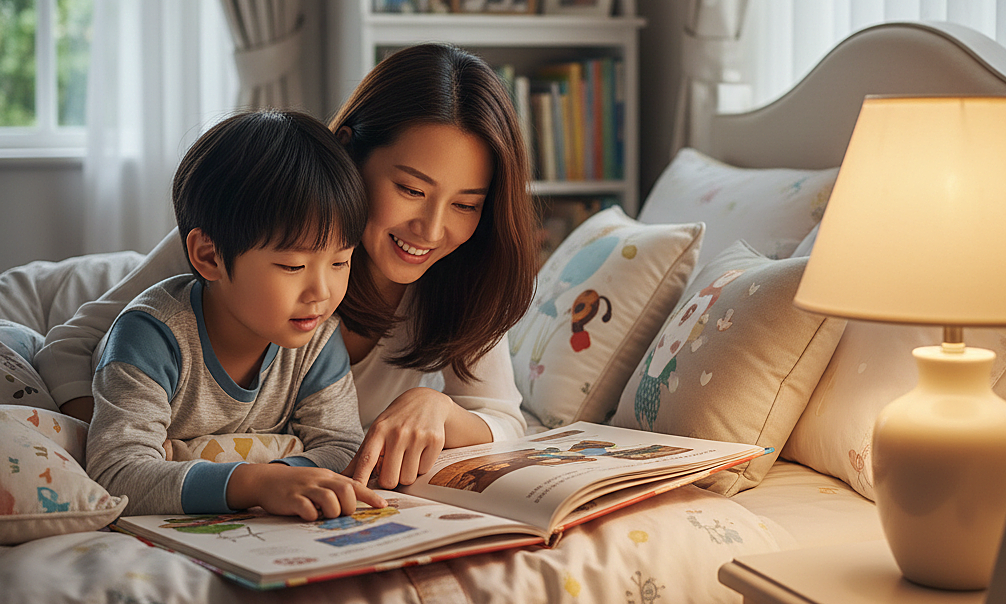 Thói quen đọc sách trước khi ngủ tốt cho não trẻ. Ảnh: AI