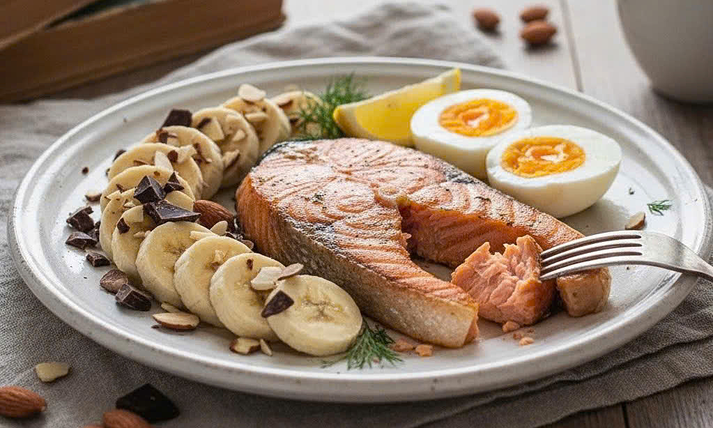 Cá hồi, trứng, chuối, hạnh nhân và chocolate đen có thể hỗ trợ sản xuất chất dẫn truyền thần kinh dopamine giúp tăng tập trung, cảm giác thư giãn.