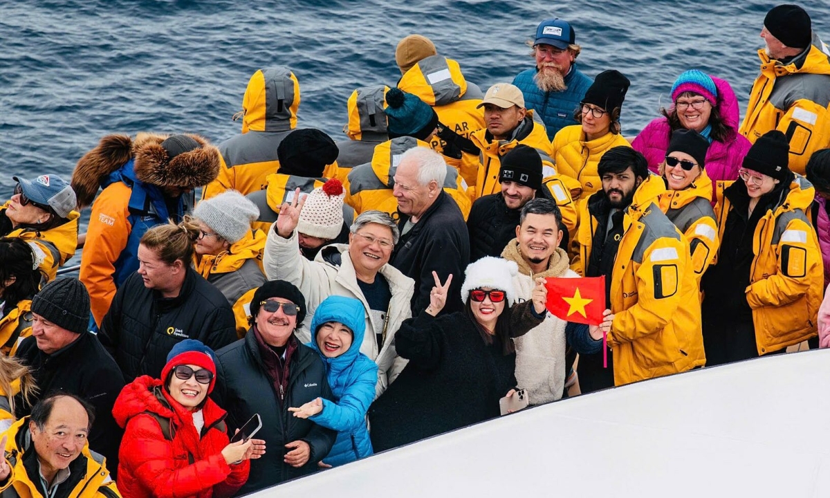 Đoàn khách Việt cầm cờ đỏ sao vàng chụp ảnh lưu niệm tại Nam Cực năm 2024. Ảnh: Hoàng Phụng Hiếu