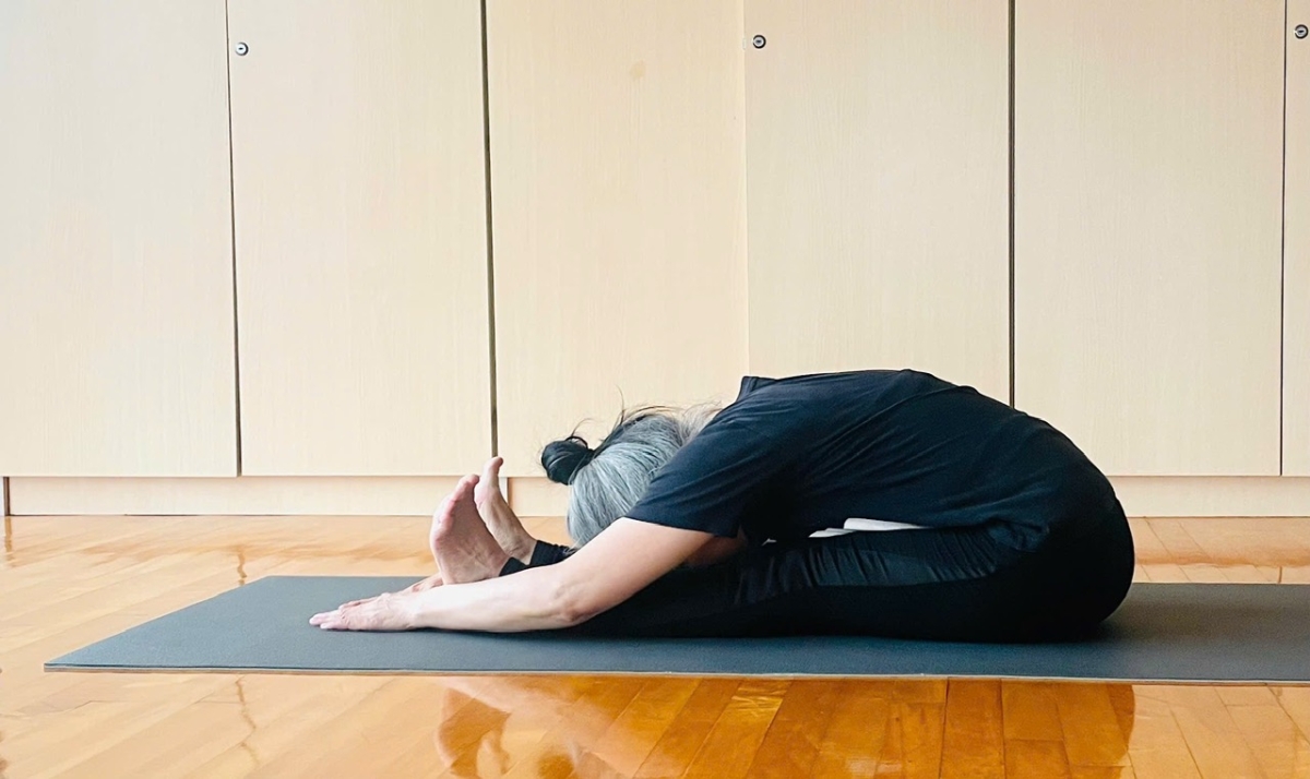 Lưng thẳng, đầu chạm cẳng chân, giữ tư thế trong 5-10 nhịp thở sâu và chậm.