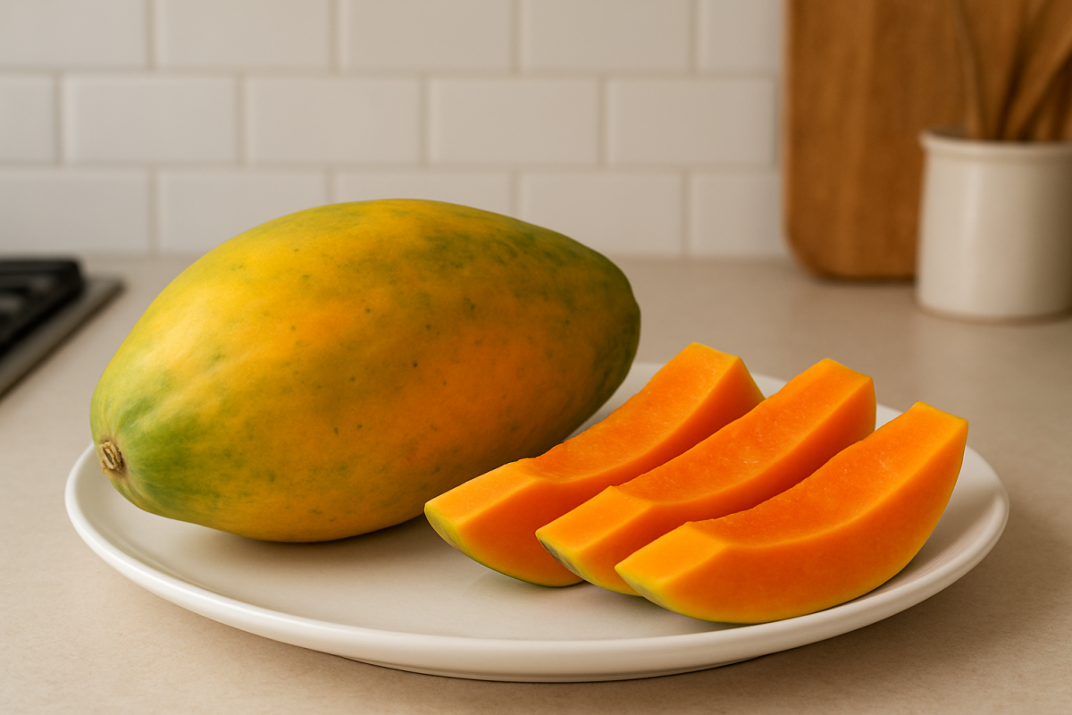Đu đủ chín giàu vitamin C và beta-carotene, giúp hình thành collagen và bảo vệ tế bào da khỏi tổn thương hàng ngày. Ăn đu đủ vào bữa sáng cung cấp dưỡng chất từ sớm, hỗ trợ phục hồi và nuôi dưỡng da ngay từ đầu ngày.