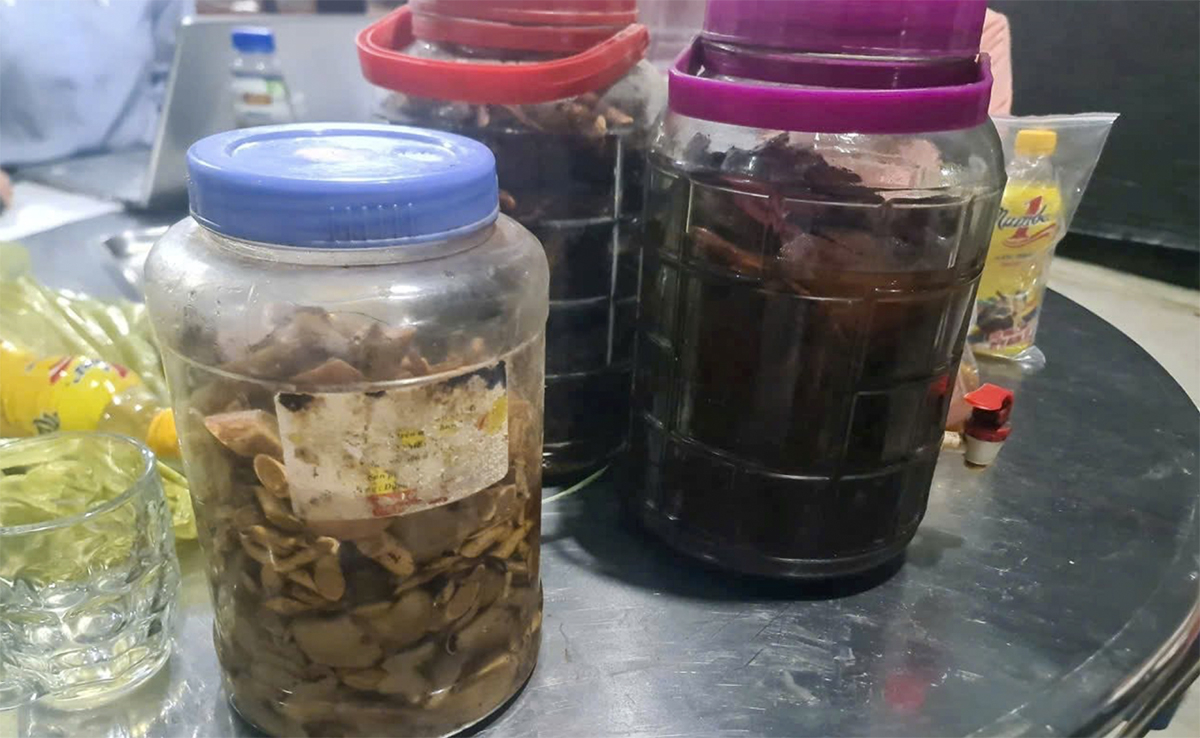 Các bình rượu ngâm được sử dụng trong cuộc nhậu tại nhà ông Trinh đã được niêm phong. Ảnh: Hùng Lê