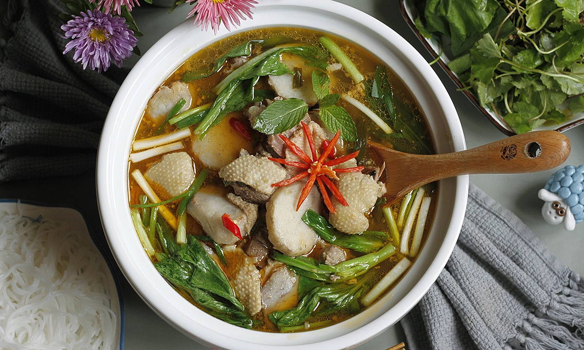 Nồi lẩu bò nhúng giấm với nước dùng chua ngọt dịu, thịt bò tươi thái mỏng nhúng ăn kèm rau xanh và bún. Đây là món ăn vừa đậm đà vừa dễ tiêu, phù hợp cho bữa chính khi du lịch nhóm. Du khách có thể tìm đến hệ thống Lẩu bò nhúng giấm Ngọc Phát với hai chi nhánh ở đường 3/2 và Trần Hoàng Na, quận Ninh Kiều.