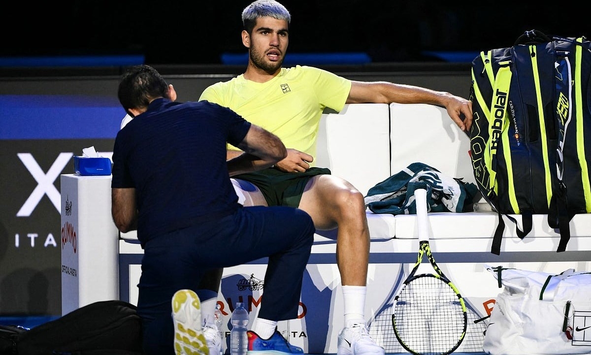 Alcaraz được chăm sóc y tế ở trận chung kết với Sinner, tại nhà thi đấu Inalpi Arena, Turin, Italy hôm 16/11. Ảnh: Reuters
