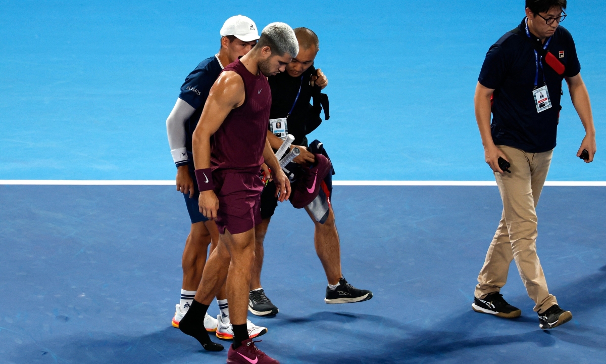 Trong điểm đầu của game thứ năm, khi tỷ số đang là 2–2, Alcaraz chạy tập tễnh và ngã xuống sân khi cố bám đuổi pha bỏ nhỏ của Baez. Anh ngồi luôn ở sân với vẻ đau đớn, rồi được đội ngũ y tế chăm sóc. Pha quay chậm cho thấy Alcaraz bị đau ở cổ chân trái hoặc gân Achilles.