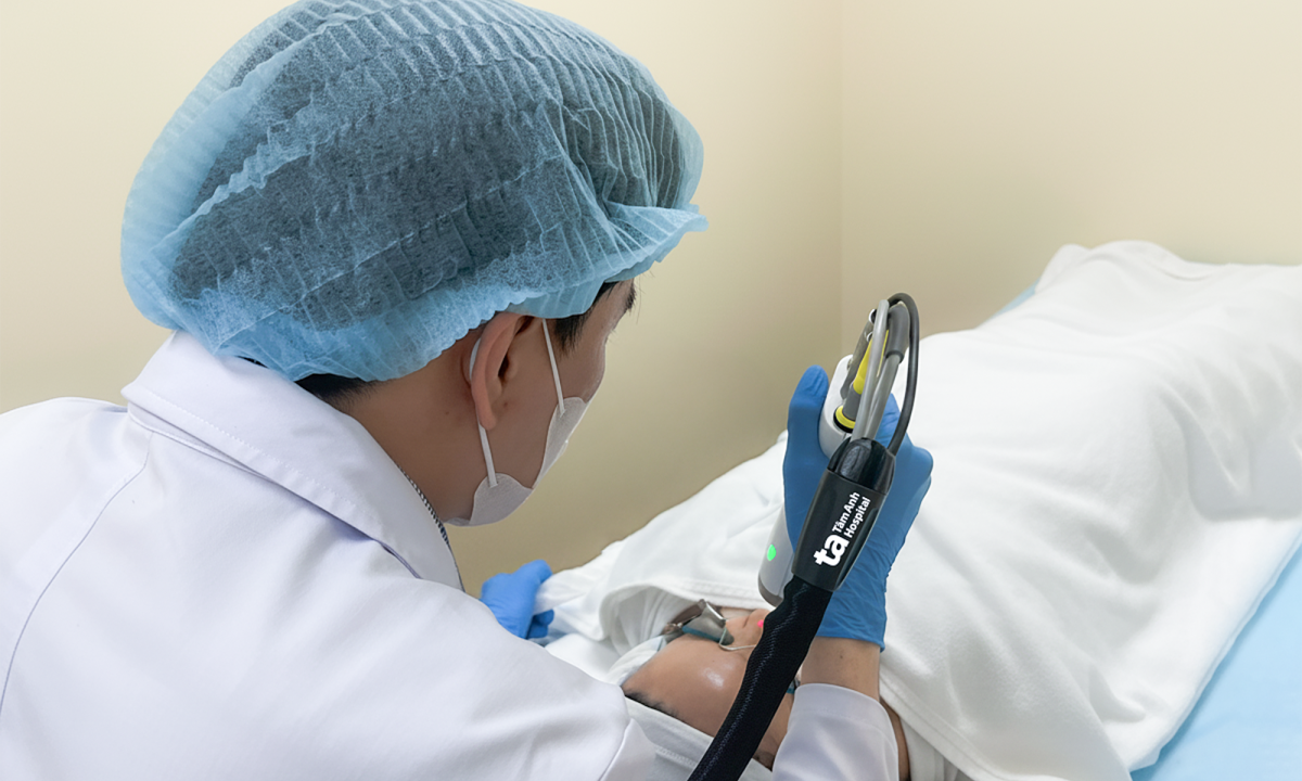 Bác sĩ sử dụng laser 6D điều trị tình trạng giãn mao mạch cho chị Hà. Ảnh: Bệnh viện Đa khoa Tâm Anh