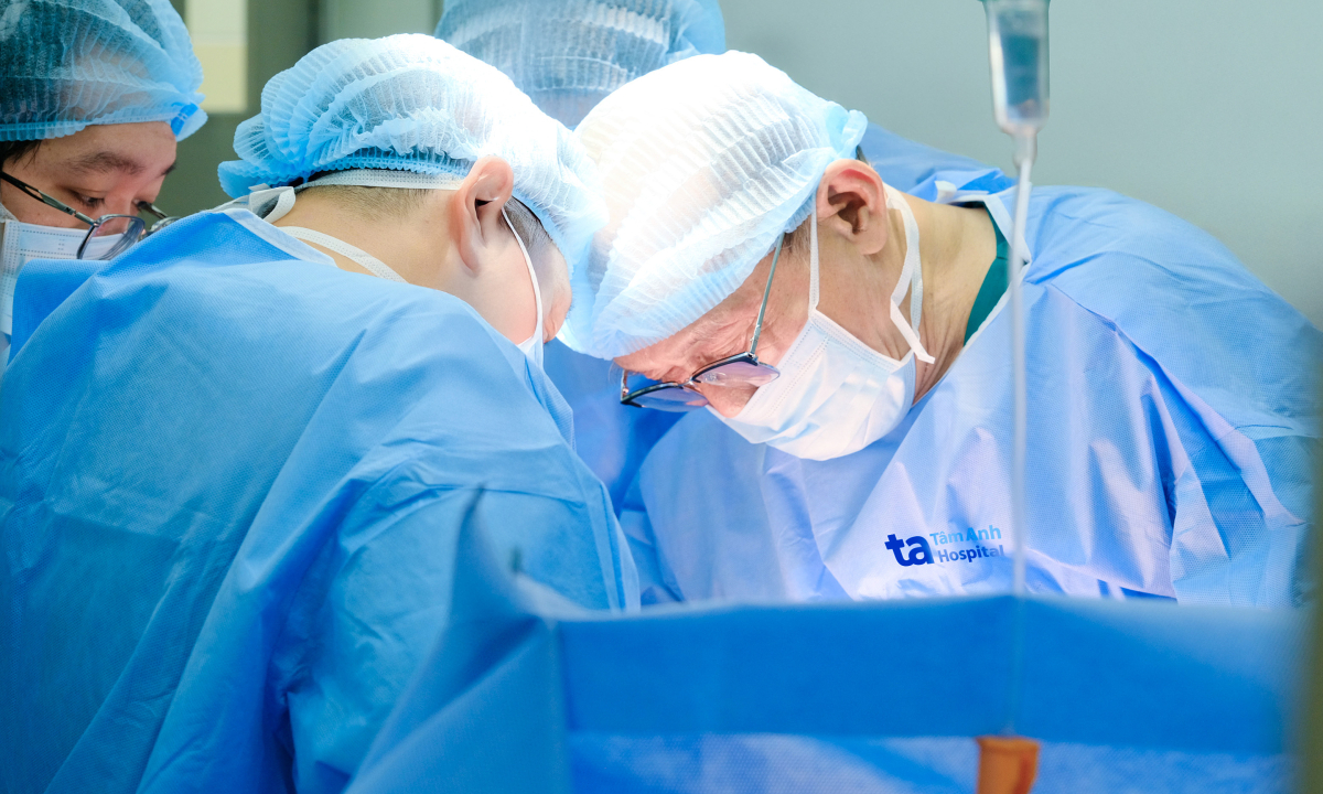PGS Chuyên cùng êkip mổ mở cắt u ác tính tái phát cho bà Vy. Ảnh: Bệnh viện Đa khoa Tâm Anh
