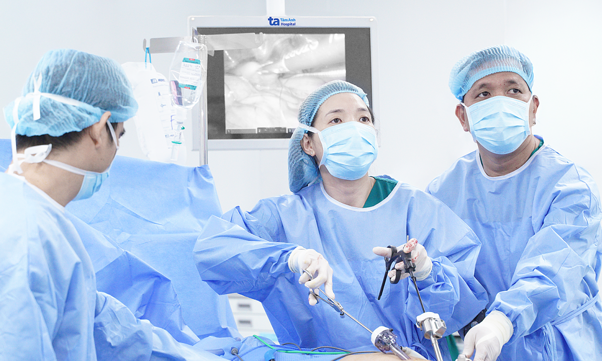 Bác sĩ Liên (giữa) và ThS.BS Nguyễn Trường Hoan phẫu thuật cho Thuận. Ảnh: Bệnh viện Đa khoa Tâm Anh