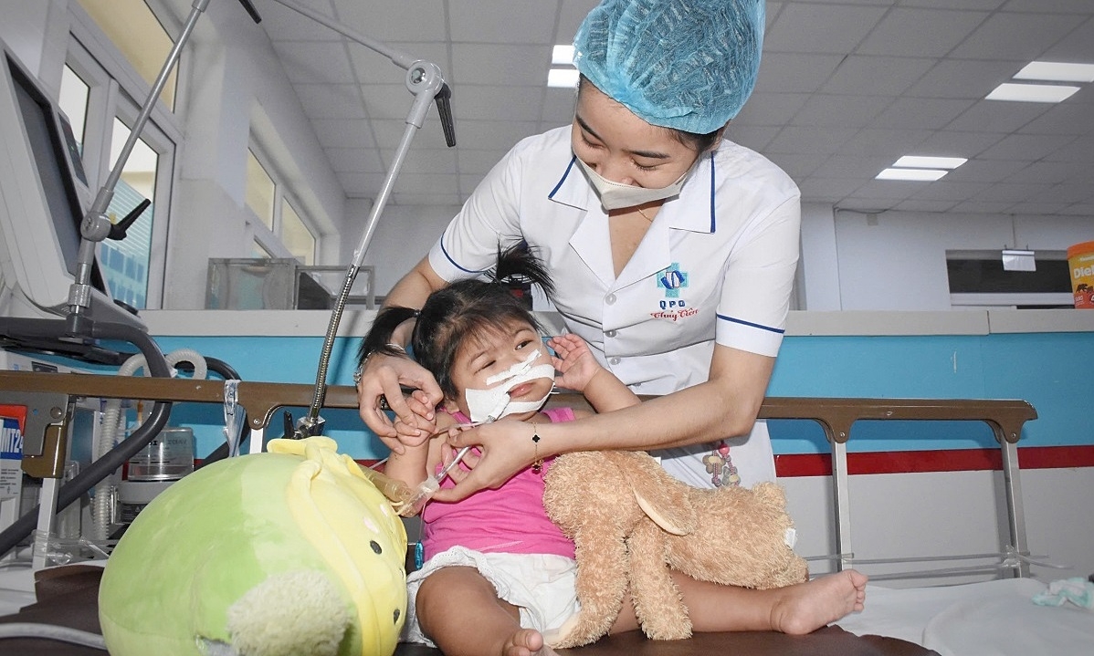 Bé Linh được điều dưỡng Lê Thủy Tiên chăm sóc tại giường bệnh. Ảnh: Thạch Thảo