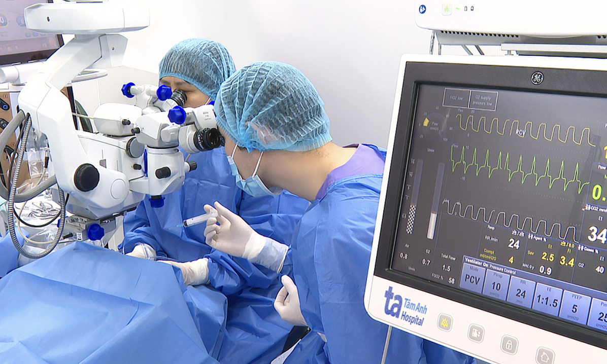 Bác sĩ Hưng và PGS Hiền cùng thực hiện phẫu thuật mổ đục thủy tinh thể bẩm sinh cho bé gái 2 tháng tuổi. Ảnh: Bệnh viện đa khoa Tâm Anh