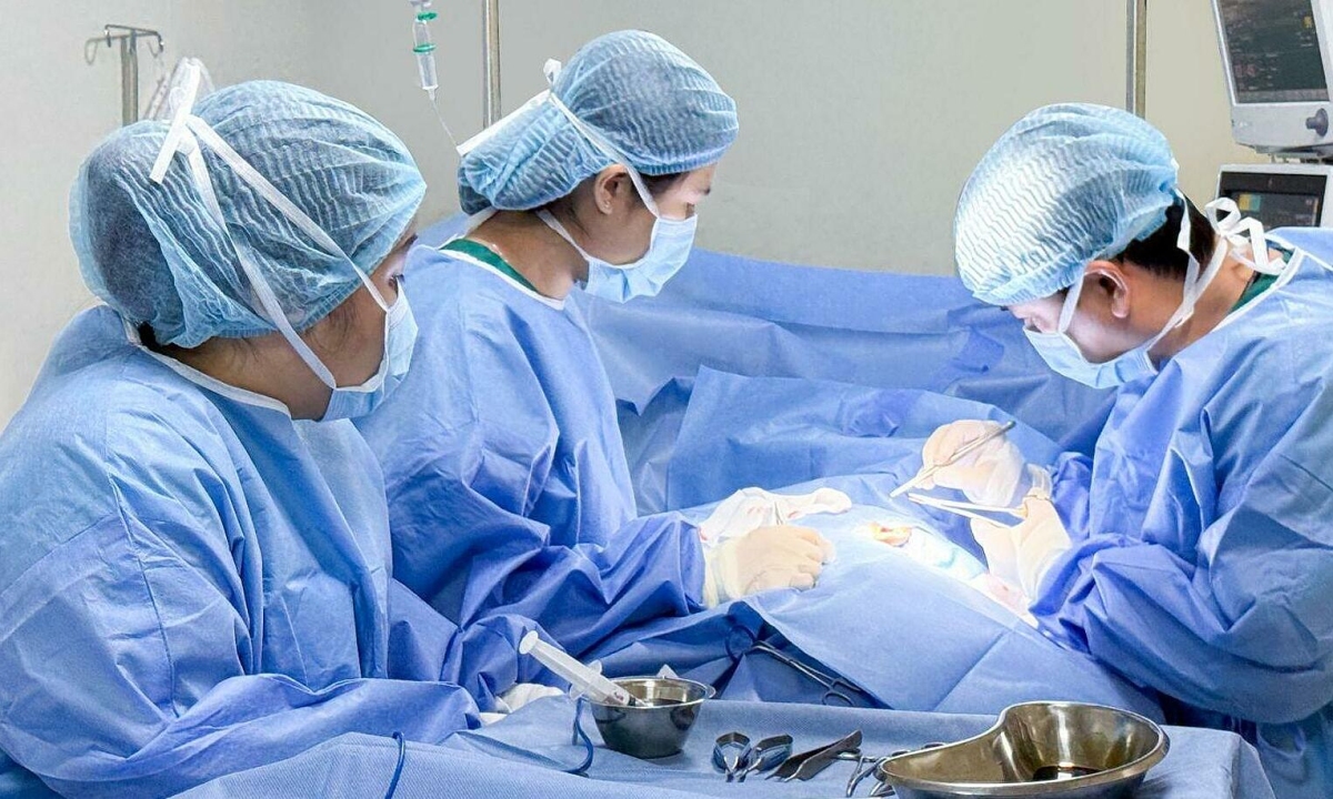 Bác sĩ Tuấn (phải) và êkíp phẫu thuật giải phóng vành tai cho bệnh nhi. Ảnh: Giản Đơn
