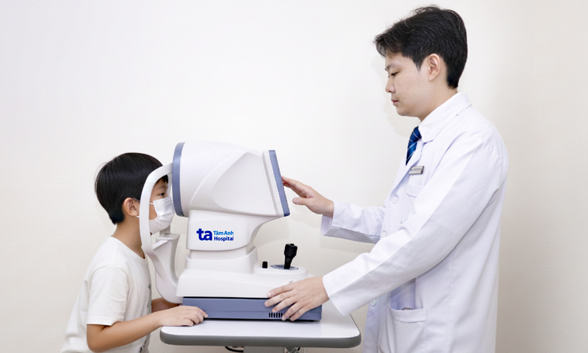 Bác sĩ Huy kiểm tra mắt cho bé Đăng. Ảnh: Bệnh viện Đa khoa Tâm Anh