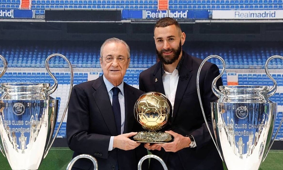 Benzema bên chủ tịch Florentino Perez và Quả Bóng Vàng cùng những chiếc Cup C1 anh từng giành trong màu áo Real Madrid. Ảnh: AFP