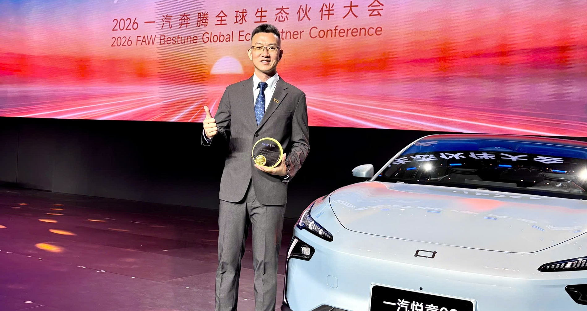Ông Dai Yong Lin, CEO Bestune Việt Nam đã nhận giải thưởng trên sân khấu, trước sự chứng kiến của ban lãnh đạo tập đoàn FAW Bestune và hệ thống đối tác từ nhiều quốc gia.