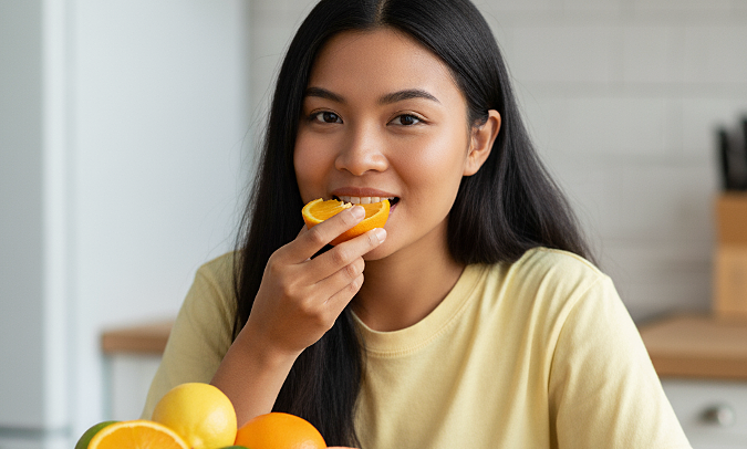 Ăn trái cây họ cam quýt, dứa chứa nhiều vitamin C giúp tăng đề kháng cho người bệnh viêm xoang. Ảnh được tạo bởi AI
