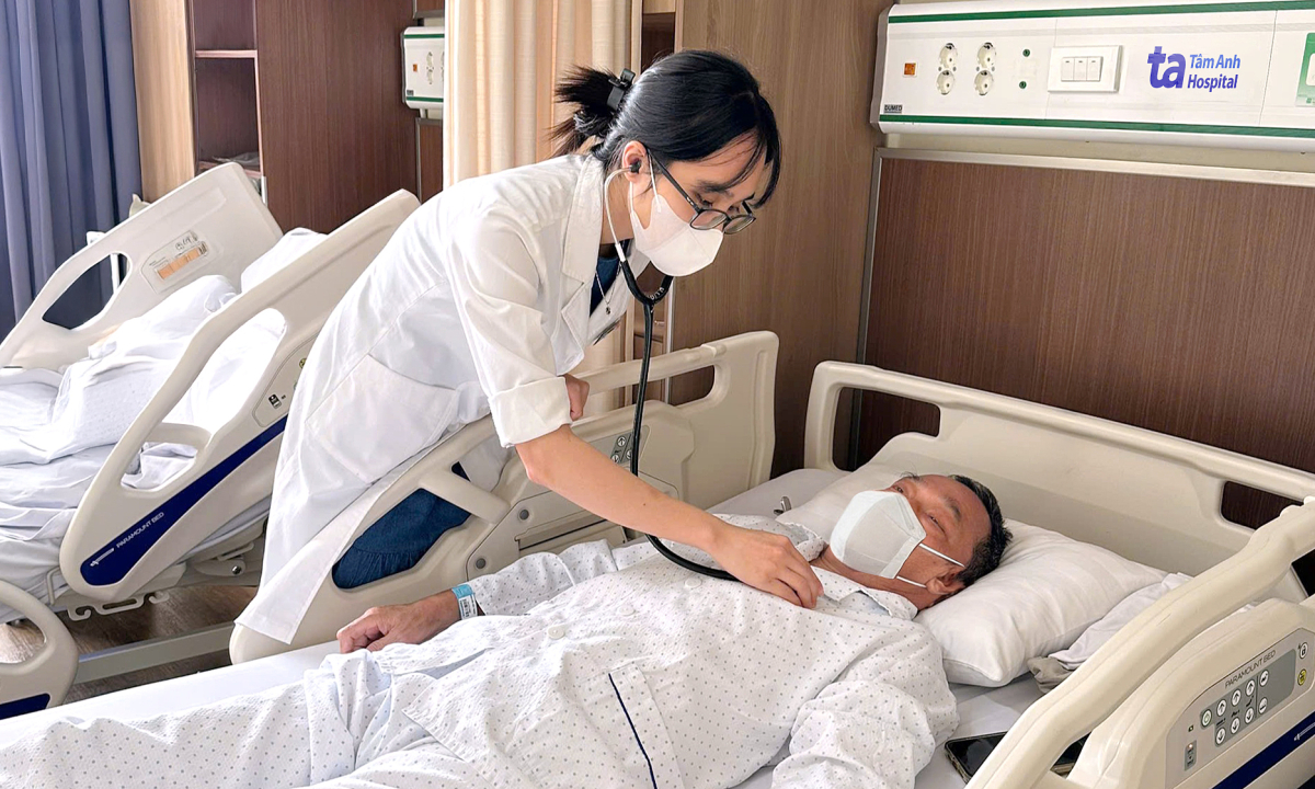 Bác sĩ Vân đang kiểm tra sức khỏe cho ông Thịnh trước khi ra viện. Ảnh: Bệnh viện Đa khoa Tâm Anh