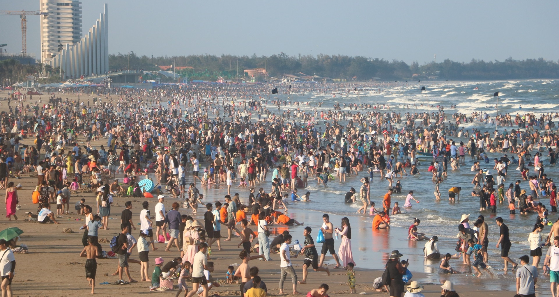 Dọc bãi tắm, từng nhóm du khách ngồi chen kín trên bờ. Dưới biển, dòng người dày đặc, tạo nên khung cảnh nhộn nhịp.