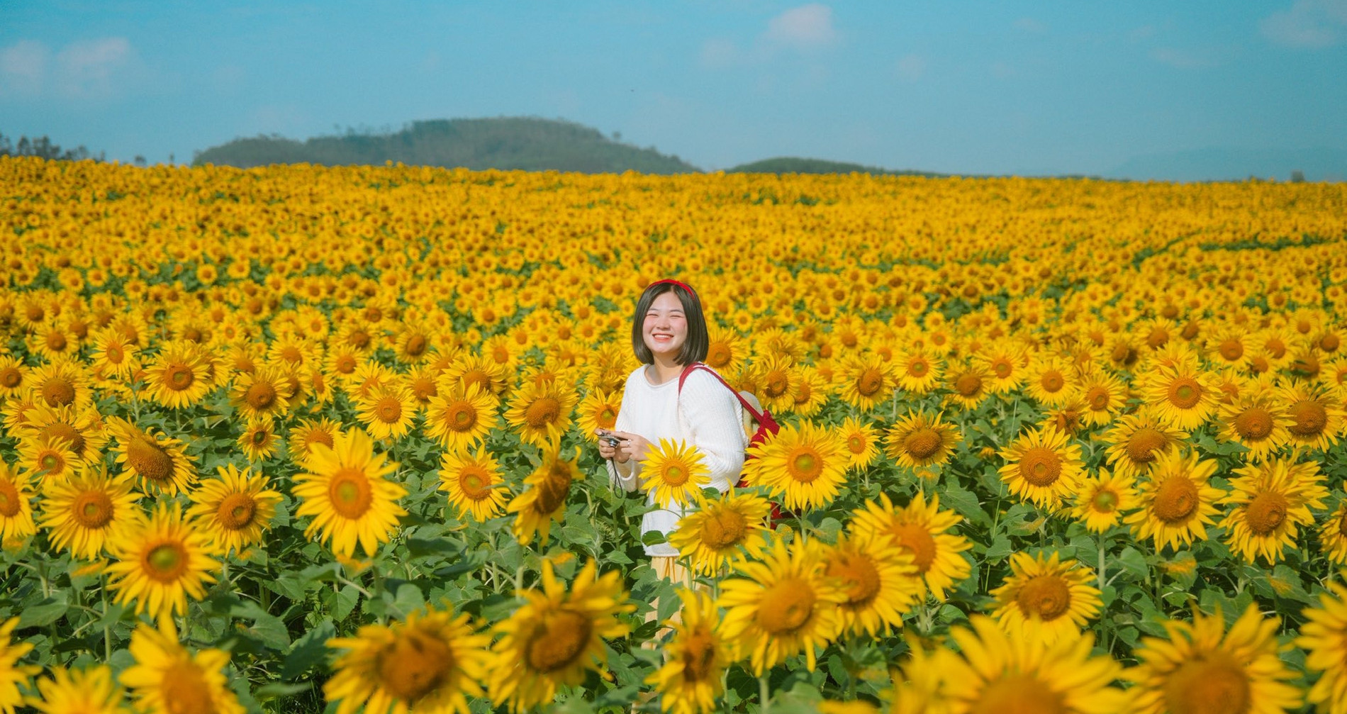 Theo kinh nghiệm của cô gái trẻ, thời điểm lý tưởng để chụp hình đẹp ở cánh đồng hoa hướng dương là vào buổi sáng, khoảng từ 8h đến 10h. Lúc này, nắng dịu nhẹ, thời tiết mát mẻ, dễ chịu, thuận tiện cho du khách tham gia các hoạt động, trải nghiệm ngoài trời.