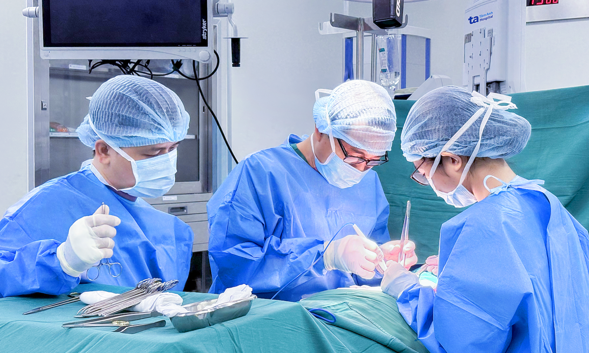 Bác sĩ Huân (giữa) cùng êkíp phẫu thuật cắt toàn bộ tuyến giáp cho bệnh nhân Lộc. Ảnh: Bệnh viện Đa khoa Tâm Anh