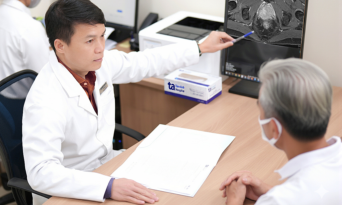 BS.CKII Ngô Trường Sơn, Phó khoa Ung bướu, Bệnh viện Đa khoa Tâm Anh Hà Nội, chỉ định lấy mẫu sinh thiết của người bệnh qua đường tầng sinh môn dưới hướng dẫn siêu âm đầu dò trực tràng. Kết quả là ung thư biểu mô tuyến nang của tuyến tiền liệt, điểm mô học đánh giá mức độ ác tính (Gleason) 9/10, thuộc nhóm nguy cơ rất cao.