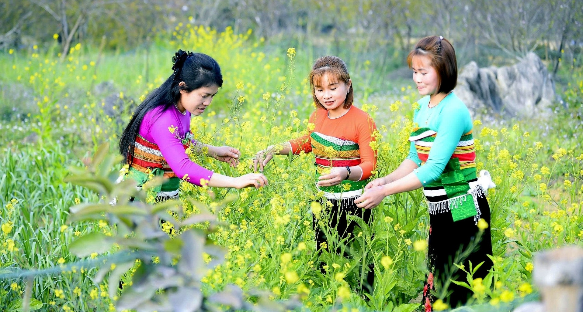Không chỉ có đào và mận, những luống hoa cải được người dân gieo trồng dọc lối đi, ven nương rẫy cũng đang vào độ nở rộ. Sắc vàng hoa cải trải dài thành từng thảm nhỏ, góp phần làm rực rỡ thêm không gian núi rừng Cổ Lũng.