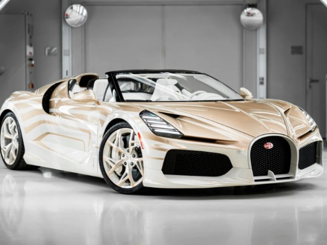 Điểm nhấn thu hút mọi ánh nhìn của Bugatti W16 Mistral La Perle Rare chính là phối màu trắng Ghost White kết hợp cùng vàng cát Dune. Các nghệ nhân tại Bugatti đã sử dụng họa tiết “Vagues de Lumière” để mô phỏng hiệu ứng thị giác của ánh sáng phản chiếu trên bề mặt sơn, tạo nên một diện mạo sống động như đang chuyển động ngay cả khi xe đứng yên.