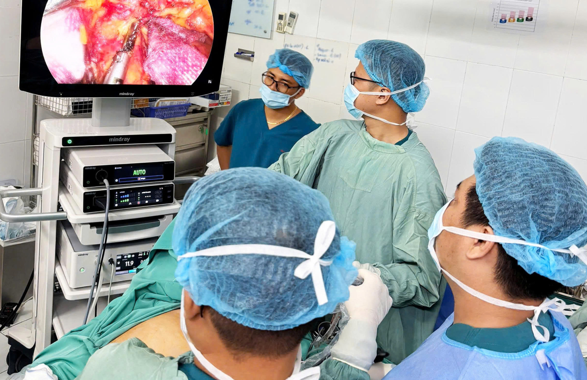 Các bác sĩ phẫu thuật nội soi cho người bệnh. Ảnh: Bệnh viện cung cấp