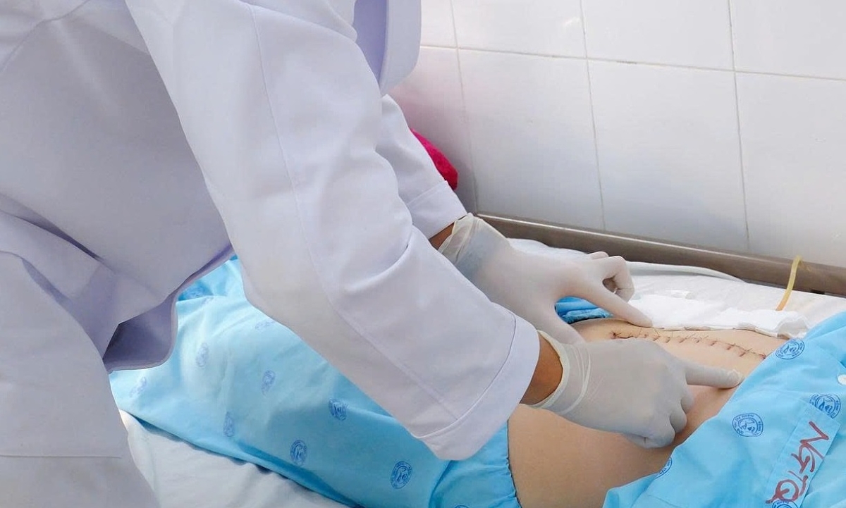 Bác sĩ kiểm tra vết mổ cho bệnh nhân. Ảnh: Bệnh viện cung cấp