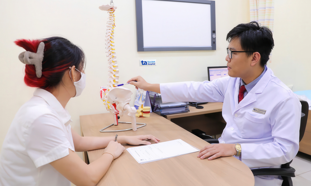 Bác sĩ Sơn giải thích tình trạng cột sống cho người bệnh. Ảnh minh họa: Phòng khám Đa khoa Tâm Anh Quận 7