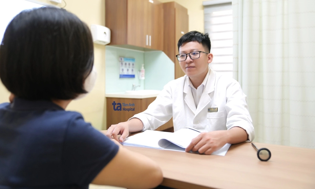 Bác sĩ khoa Thần kinh Đột quỵ khám cho người bệnh đau đầu. Ảnh: Bệnh viện Đa khoa Tâm Anh