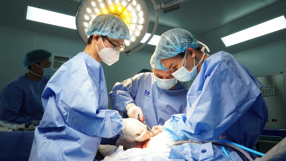 Bác sĩ Vũ (giữa) phẫu thuật tái tạo dây chằng cho người bệnh. Ảnh: Bệnh viện Đa khoa Tâm Anh