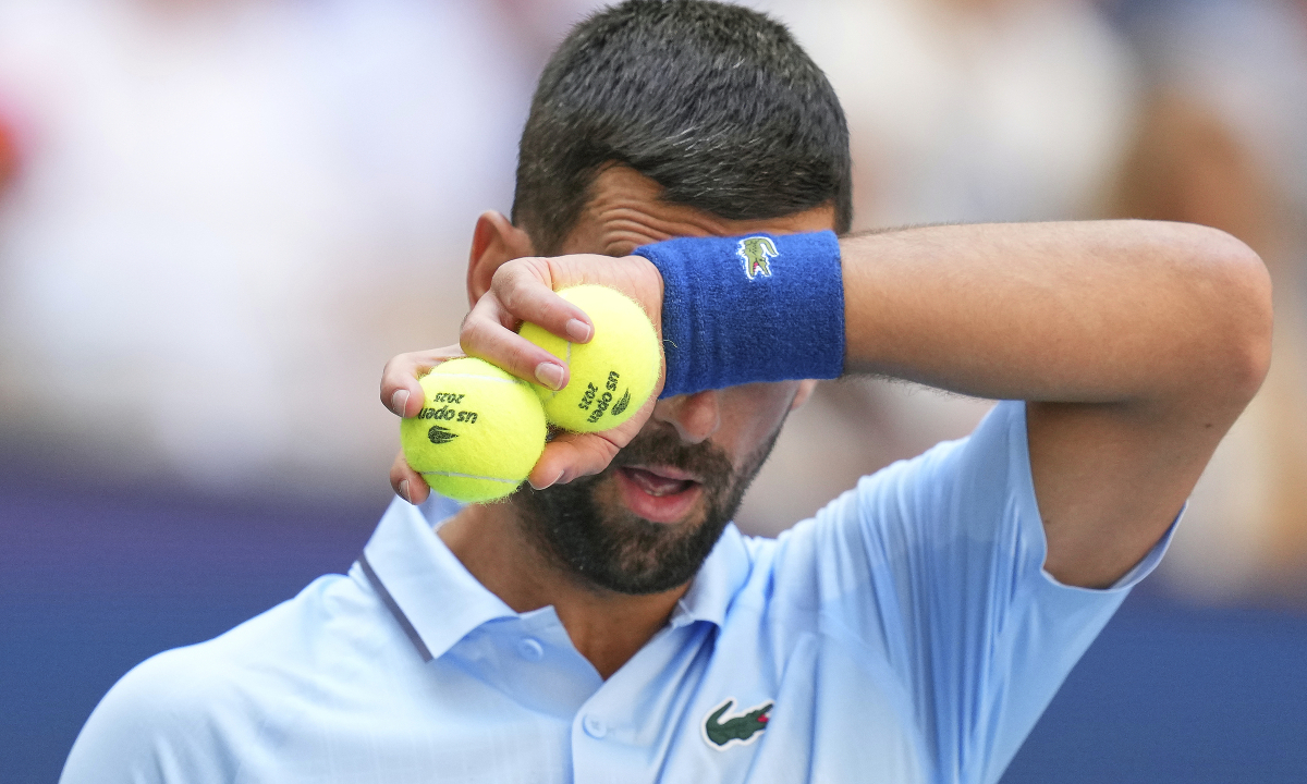 Djokovic vuốt mồ hôi trán trong trận đấu Zachary Svajda,ở vòng 2 Mỹ Mở rộng ngày 27/8/2025 tại New York. Ảnh: AP