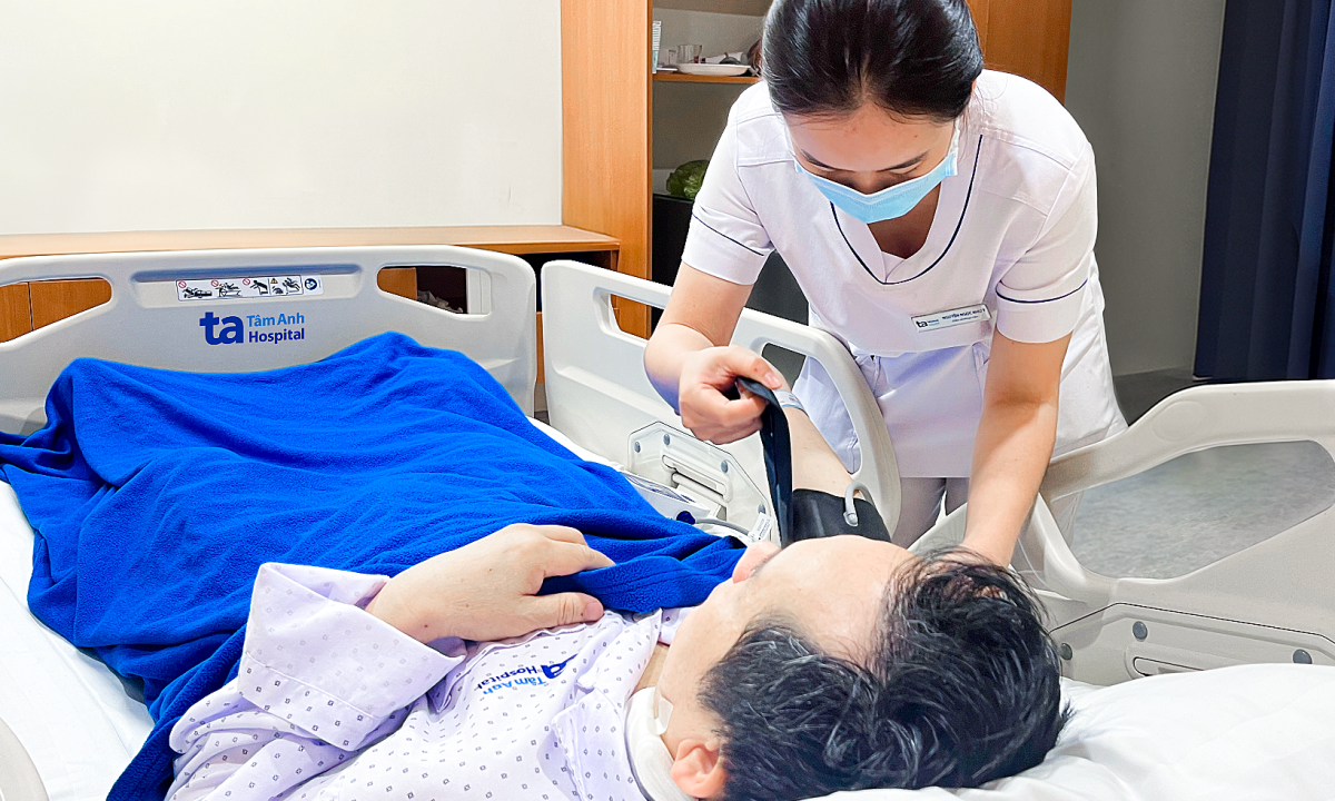 Điều dưỡng kiểm tra huyết áp cho anh David trước lúc xuất viện. Ảnh: Hạ Vũ