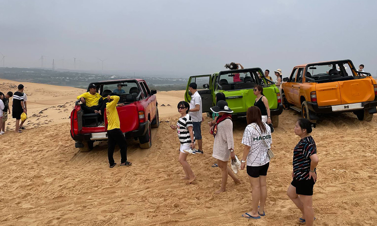 Du khách trải nghiệm xe địa hình ở Bàu Trắng. Ảnh: Hồng Hạnh