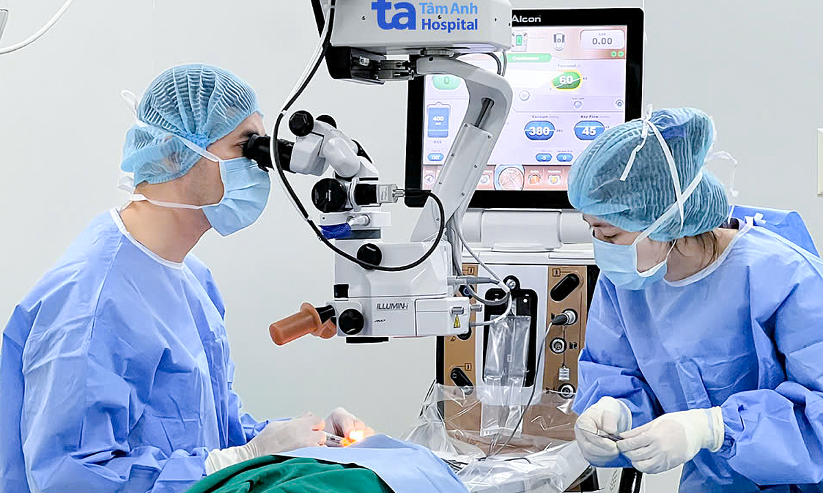 Bác sĩ phẫu thuật đục thủy tinh thể mắt phải cho người bệnh. Ảnh: Bệnh viện Đa khoa Tâm Anh