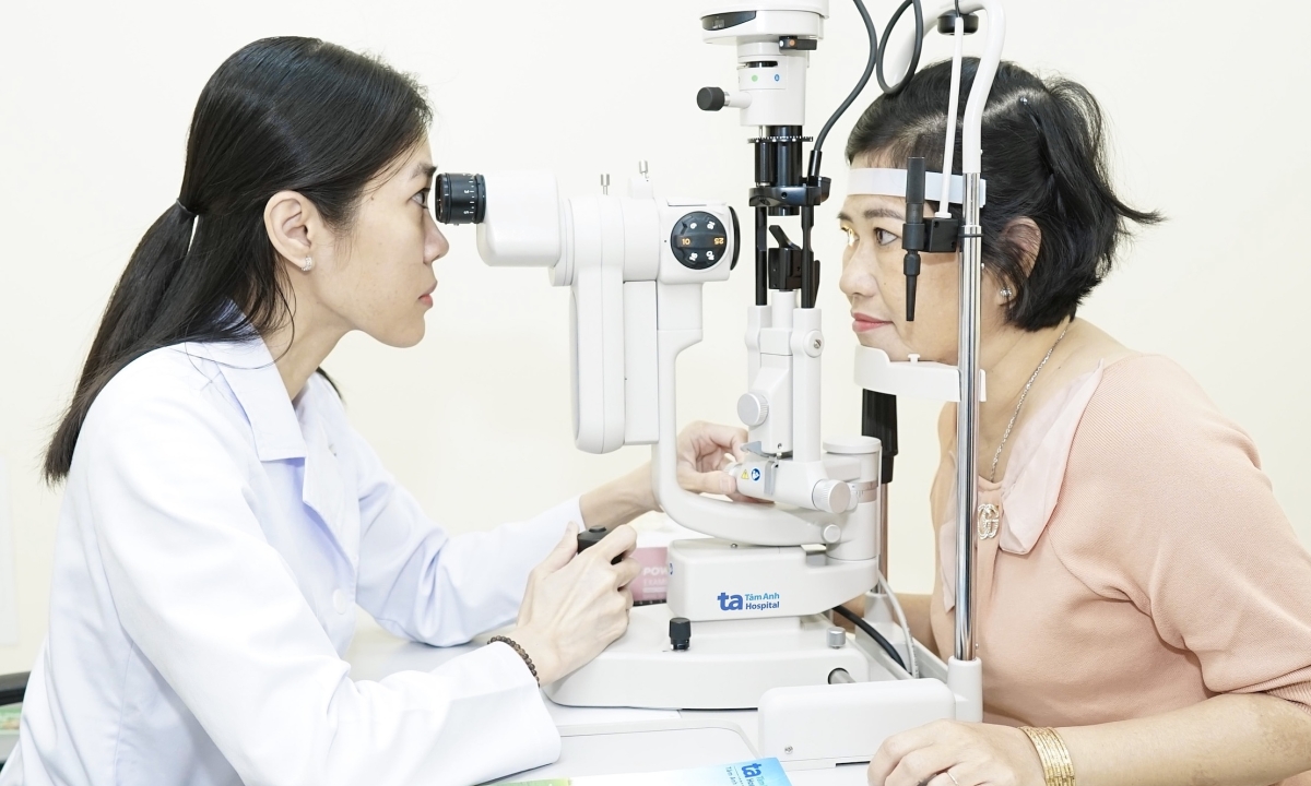 Bác sĩ Tăng Ngọc Anh tái khám cho chị Loan sau mổ đục thủy tinh thể hai mắt. Ảnh: Bệnh viện Đa khoa Tâm Anh