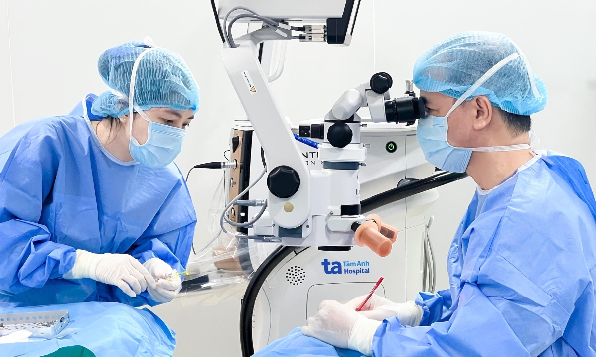 Bác sĩ phẫu thuật thay thủy tinh thể nhân tạo đa tiêu mắt phải cho bà Mai. Ảnh minh họa: Bệnh viện Đa khoa Tâm Anh