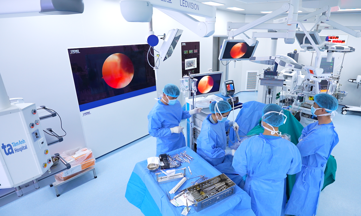 Bác sĩ Hiếu và êkíp tái tạo dây chằng cho bệnh nhân Tuấn. Ảnh: Bệnh viện Đa khoa Tâm Anh