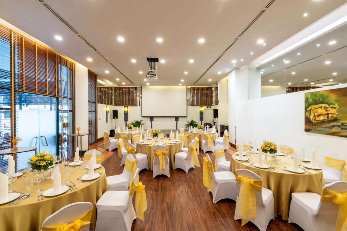 Khách doanh nghiệp, công ty có thể chọn tiệc cocktail hoặc tiệc truyền thống với menu đa dạng. Khu vực tổ chức linh hoạt từ hội trường đến ngoài trời. Ngay trong khuôn viên khách sạn là hồ bơi rộng rãi, hợp tổ chức các bữa tiệc cuối năm, sân khấu ngoài trời.