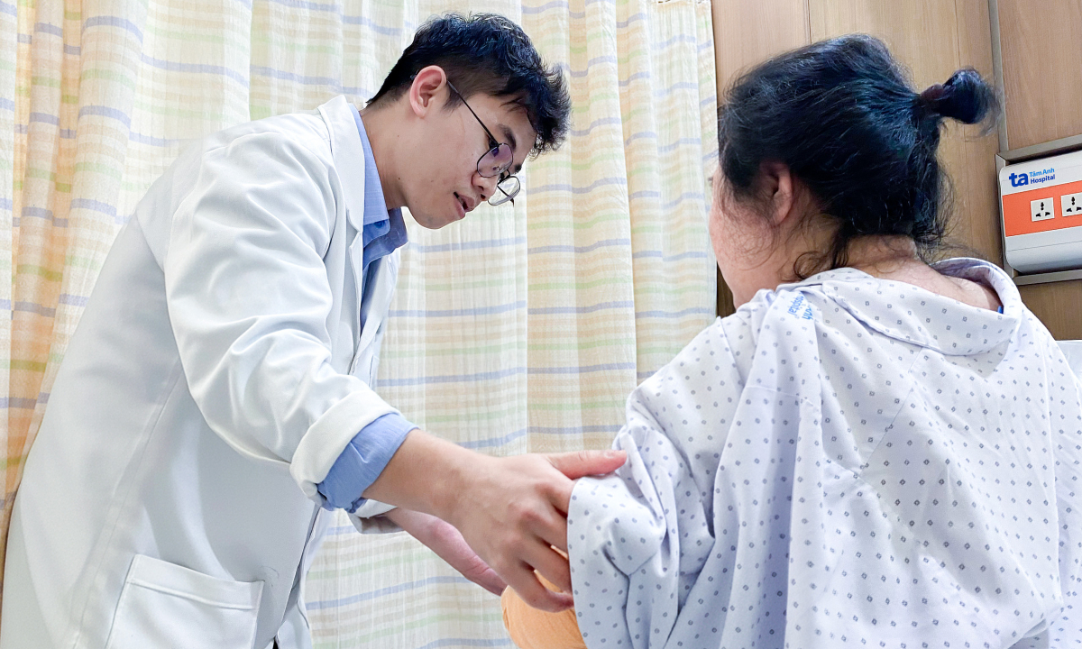 Bác sĩ Thạnh kiểm tra tình trạng người bệnh trước khi xuất viện. Ảnh: Bệnh viện Đa khoa Tâm Anh