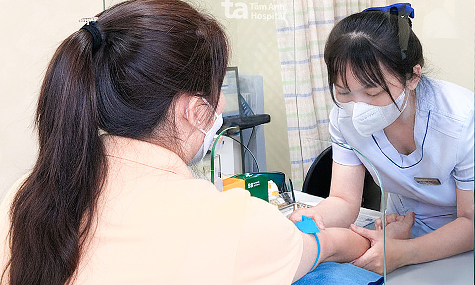 Chị Thu được lấy máu làm xét nghiệm các chỉ số cơ thể. Ảnh: Bệnh viện Đa khoa Tâm Anh