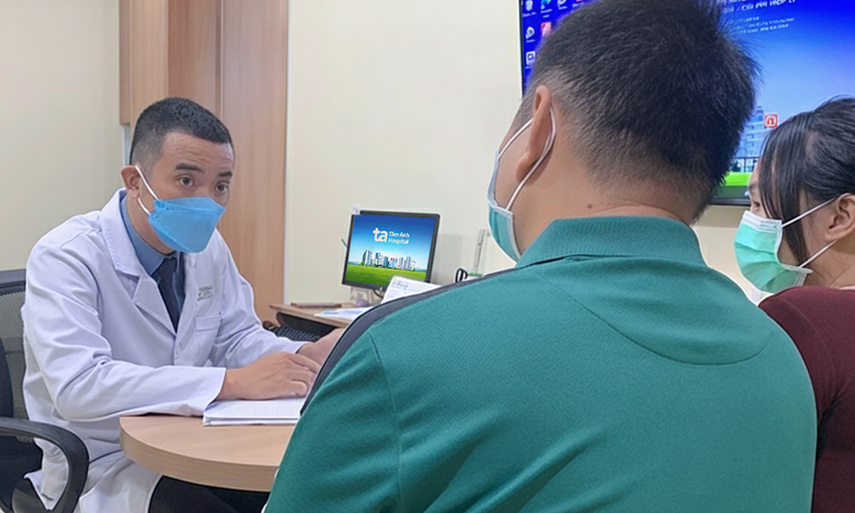 Tiến sĩ Tùng tư vấn liệu trình giảm cân cho vợ chồng anh Công. Ảnh: Bệnh viện Đa khoa Tâm Anh