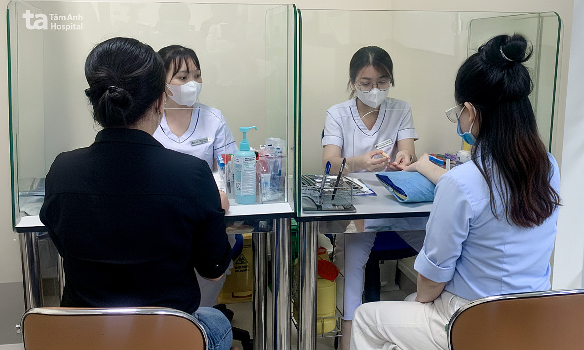 Chị Hoài và chị Thu (áo đen) được lấy máu xét nghiệm và kiểm tra đường huyết. Ảnh: Bệnh viện Đa khoa Tâm Anh
