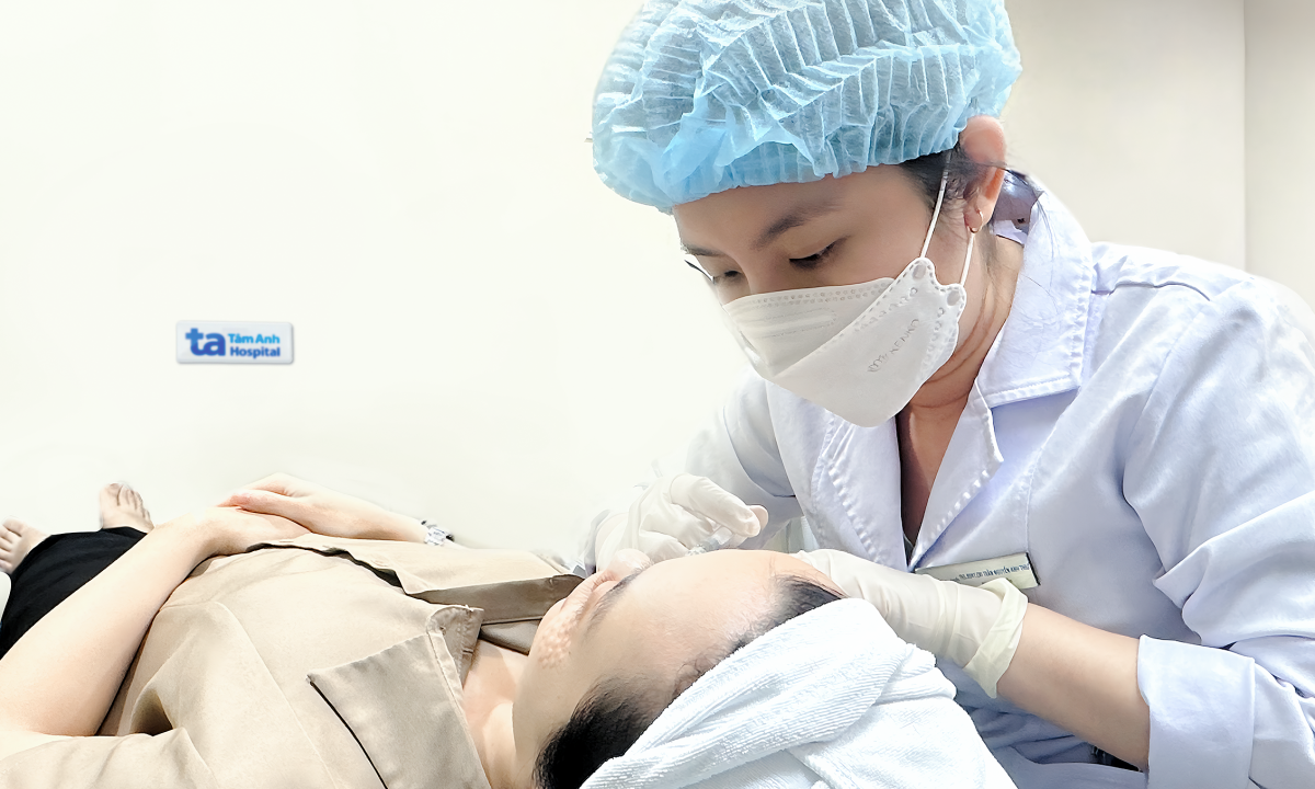 Bác sĩ tiêm meso trị quầng thâm mắt cho chị Hằng. Ảnh: Bệnh viện Đa khoa Tâm Anh