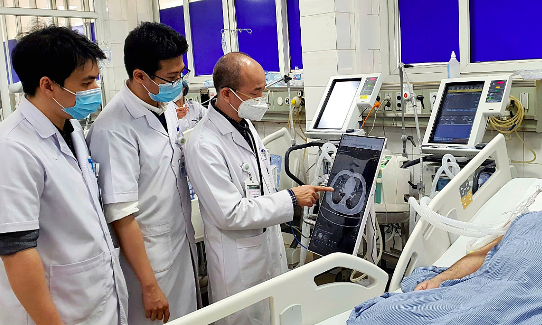 Các bác sĩ Bệnh viện Bạch Mai kiểm tra phim chụp của bệnh nhân hiển thị trên bệnh án điện tử ngay tại giường bệnh. Ảnh: Nguyên Hà