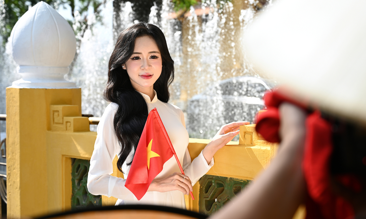 Người Hà Nội chụp ảnh áo dài ở Lăng Chủ tịch Hồ Chí Minh hôm 11/8. Ảnh: Giang Huy
