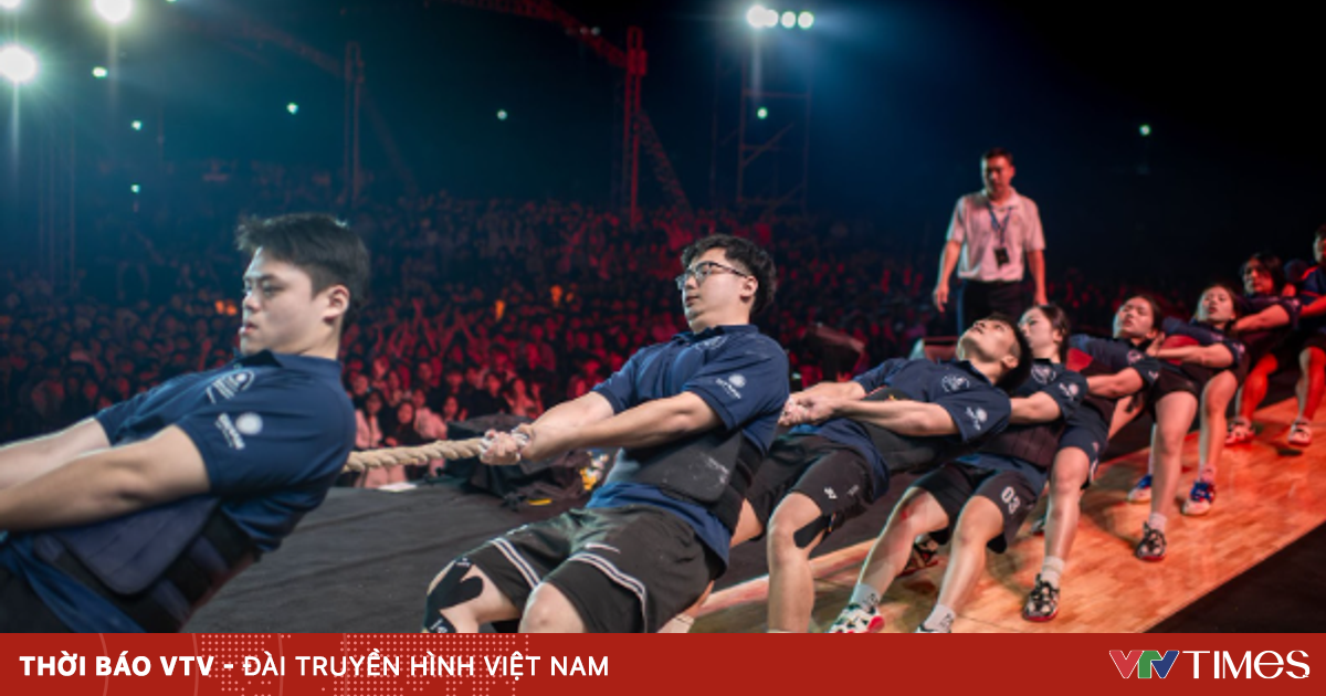 Nam Khánh (đeo kính) căng sức cùng đội thi ĐH Đại Nam trong trận tranh giải Ba tại Vòng Chung kết Giải vô địch kéo co Thanh niên 2025